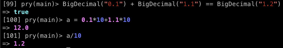 ruby에서는 정확한 값을 구하기 위해 정수형으로 만들어 계산 해주거나 BigDecimal 을 이용하면 된다.