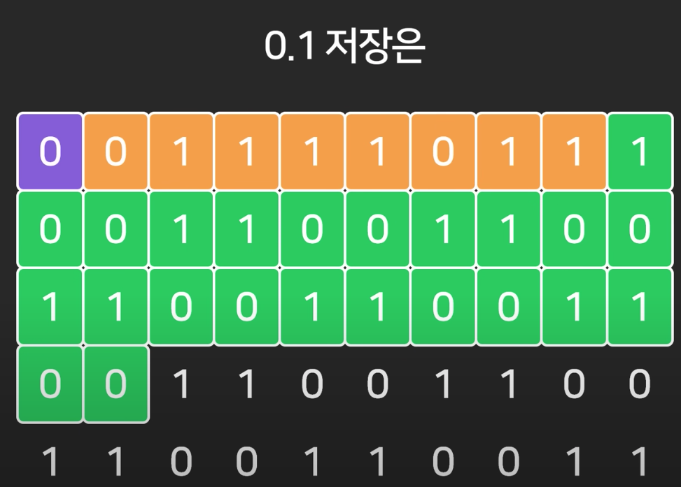 10진수 0.125 는 2진수 0.001 로 표현하면 된다. 하지만 10진수 0.1 은 0.000110011 .... 0.1 을 정확하게 표현할 수가 없다.