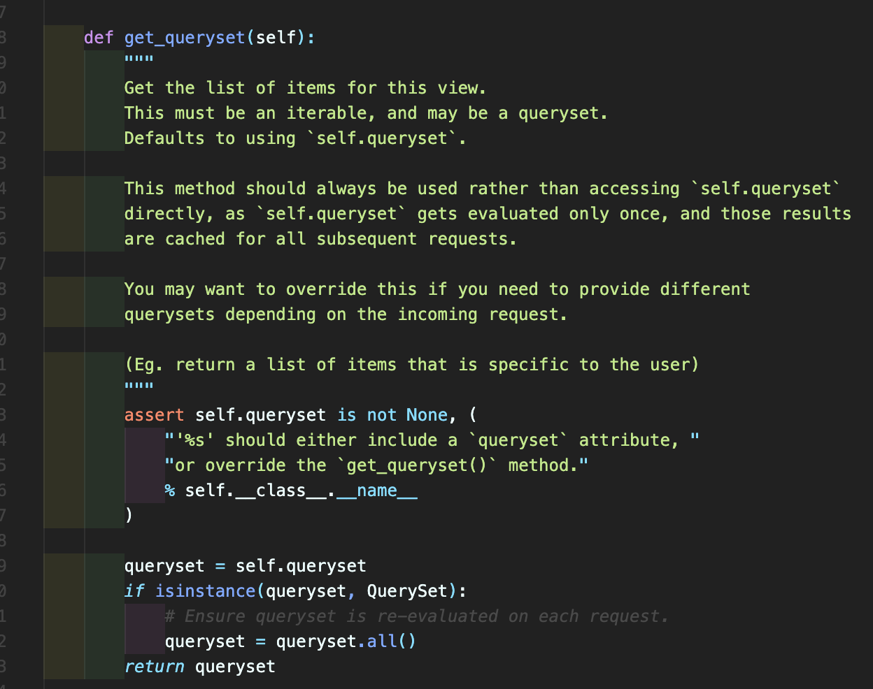 package 파일의 get_queryset 부분을 보면 assert self.queryset is None으로 해당 에러의 내용이 정의된 것을 볼 수 있다. get_queryset 은 최초에 호출되고 이후 요청들에 결과가 캐시된다고 한다.