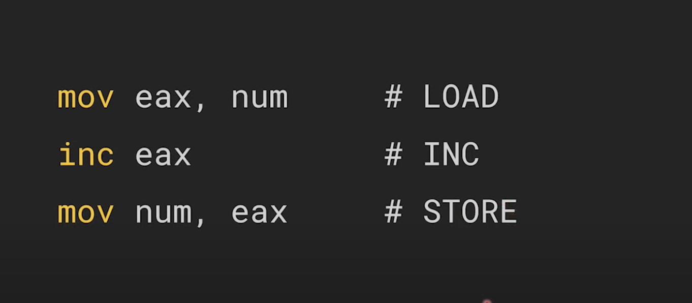 위의 어셈블리어 처럼 3가지의 최소한의 동작으로 변수에 1을 더해주는 작업이 진행되는데요.