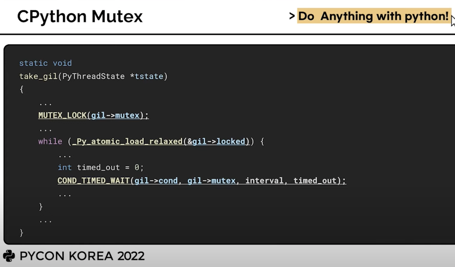 Python의 대표적인 인터프리터인 CPython에서 실제로 gil이 돌아가는 Mutex lock의 코드를 보면